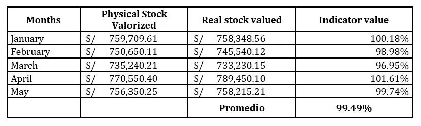 Continue to improve implementation so that all our standard indicators are in world-class values. It was possible to reduce the time with the Just In Time methodology in the warehouse inventory process, obtaining up to 53% improvement in inventories. For this reason, it is recommended to maintain the methodology over time, since some changes could be lost due to the lack of commitment of the staff.