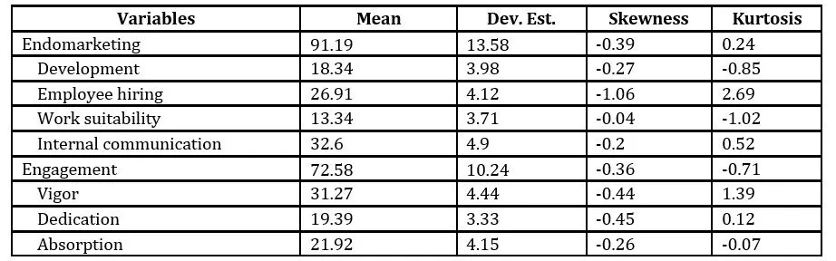 Table 1 shows that the skewness and kurtosis scores of the variables are within the range of +/-2, indicating a normal distribution of the data. Regarding Endomarketing, the mean of 91.19 suggests a high general level, with a symmetrical distribution (skewness of -0.39) and moderately pointed (kurtosis of 0.24). Regarding engagement, the average of 72.58 indicates a high level, with a symmetrical distribution (asymmetry of -0.36) and slightly flattened (kurtosis of -0.71). Consequently, parametric tests are used for the corresponding statistical analyses.