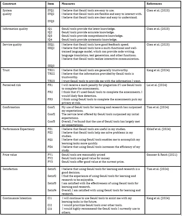 Using a survey tool, GenAI tool demographic and background data pertaining to higher education students were gathered. The factor that the research question sought to understand was students’ intentions to continue using the technologies for academic purposes. The survey tool was created through the modification of validated instrument items to align with the specific purposes of the research study. The constructs names: Information quality (IQ), System quality (SYQ), and Service quality (SEQ) adapted from (Chen et al., 2023). Trust (TRU) and Continuance Intention from (Kang et al., 2024), Confirmation (Conf) and Satisfaction (Satisf) from (Tian et al., 2024), Performance expectancy (PE) from (Khlaif et al., 2024), Perceived risk (PR) from (Lai et al., 2024), and Price value (PV) from (Gansser & Reich, 2021). All measurement items employed a seven-point Likert scale with responses spanning from 1 (“strongly disagree”) to 7 (“strongly agree”).