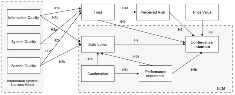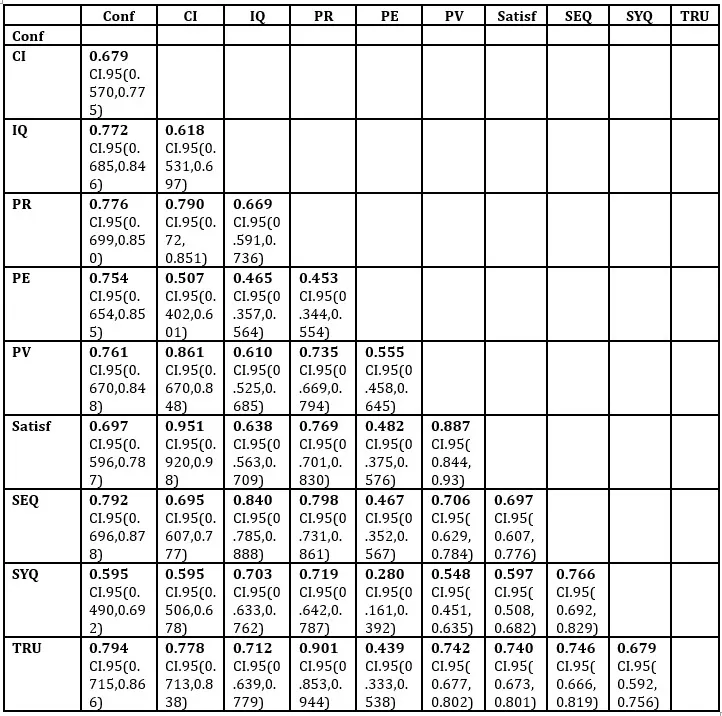 Note: “Confirmation (Conf), Continuous intention (CI), Information Quality (IQ), Perceived Risk (PR), Performance expectancy (PE), Price Value (PV), Satisfaction (Satisf), Service Quality (SEQ), System Quality (SYQ), Trust (TRU)