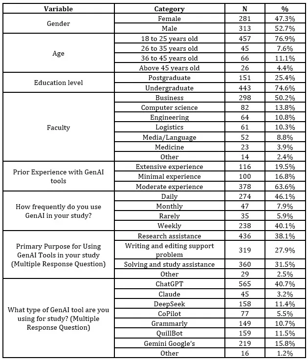 The questionnaire was completed and subsequently distributed through the Zoom Survey platform to students in higher education institutes in Egypt. Participants were recruited through non-probability convenience sampling using university mailing lists, student groups and various social media platforms. This sampling technique was chosen because the GenAI tools in education are still in the emerging stage, which means the target population should have had a certain level of interaction with such tools. The sample consisted of 734 undergraduates and postgraduates in higher education from four reputable private universities in Egypt. 140 responses were considered invalid as either the responses were incomplete, or the participants had never used GenAI tools. Therefore, 594 responses were used for further analysis.