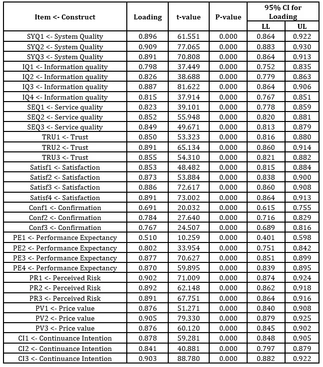 The assessment of the Heterotrait-Monotrait (HTMT) criterion ensures there is adequate discriminant validity for all construct pairs. Most HTMT values remain below the conservative threshold of 0.90 for related constructs; the highest value of 0.951 is the one obtained for Satisfaction and Continuance Intention (Henseler et al., 2015). The 95% confidence intervals for HTMT ratios also lend support, as all intervals remain less than 1.0, showing the constructs are indeed distinct. This is a significant finding due to the expected theoretical relations between these constructs, as it has been shown they are related, while still representing different conceptual domains. The results of discriminant validity as a whole show that every construct contains variance that is not explained by other constructs in the model, which supports the theoretical distinctiveness of the constructs, and confirms the measurement model is appropriate for the subsequent structural analysis.