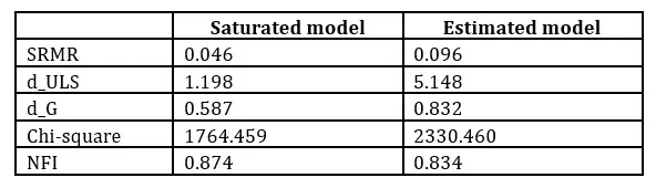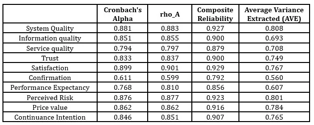 The Average Variance Extracted (AVE) scores for most constructs provide additional evidence for convergent validity for the models. All constructs achieve AVE scores above the 0.50 mark which indicates that these constructs account for more than 50% of the variance in their respective indicators (Fornell & Larcker, 1981). The internal consistency evaluation demonstrates that AVE is more than 0.5 which indicates strong internal consistency. Cronbach alpha scores between 0.611 and 0.899 are recorded, whereby most constructs surpass the benchmark threshold of 0.70 (Nunnally & Bernstein, 1995). The rho-A values, as an alternative and more robust indicator of internal consistency which is less impacted by the number of items, confirm these observations by yielding values between 0. 599 and 0.901, reinforcing the evidence concerning model reliability. Every construct, on the other hand, as PLS-SEM evidence composite reliability values lower than PLS-SEM thresholds of 0.793, surpasses the 0.70 standard benchmark set (Hair et al., 2019).