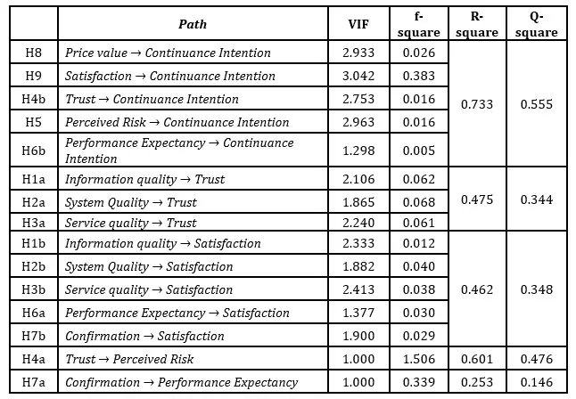 The structural model exhibits good collinearity properties as all variance inflation factor values are significantly below the critical limit of 5.0. VIF values vary within the interval of 1.0 to 3.042, hence, multicollinearity is not a concern with regards to the model, its validity or the understanding of path coefficients. The greatest VIF of 3.042 is seen with the satisfaction to continuance intention relationship, and even this figure is VIF, satisfaction and intention, theoretical overlap, not analytically weak value within satisfactory considerate bounds, and it does not overreach the boundaries of value analytical strength. The strong R² and Q² values, combined with acceptable collinearity indicators, support the model’s validity and practical utility for guiding educational technology implementation strategies. The common method bias does not significantly undermine the validity of the findings. Harman’s single factor test which uncovered, to the extent of 44.6%, the total variance, in disguise, is a way of showing how it is only weakly above the baseline requirement, or, 50%, and therefore, it disproves the assertion made by (Podsakoff et al., 2003). Furthermore, the collinearity diagnosis showed that the highest VIF value calculated in the model was 3.042, which is well below the typical cut off value of 5.0. (Hair et al., 2019). These findings indicate that method bias is not an issue in the dataset, which allows the dataset to be considered reliable for the analysis that follows and its interpretations.