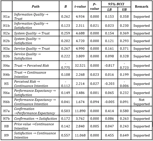 Path coefficient estimation constitutes the central analytic procedure in structural equation modeling, substantiating the hypothesized interrelationships in the proposed measurement framework. The strength and direction of relationships between latent variables are measured through path coefficients, taking on values between -1 and +1, such that greater absolute magnitudes denote stronger effects (Hair et al., 2019). The empirical significance of these coefficients is evaluated via t-statistics and p-statistics obtained through bootstrapping resampling, where t-statistics that exceed 1.96 and corresponding p-statistics that fall below 0.05 signal significance at the 95% confidence threshold. The bias-corrected confidence intervals (BCCI) provide additional robustness to the significance testing by accounting for potential sampling bias in the bootstrap distribution. All hypotheses were supported. Conversely, Performance Expectancy → Continuance Intention (β = 0.041, t = 1.674, p = 0.094) presents insignificant relationships. Therefore, hypothesis H6b was not supported.