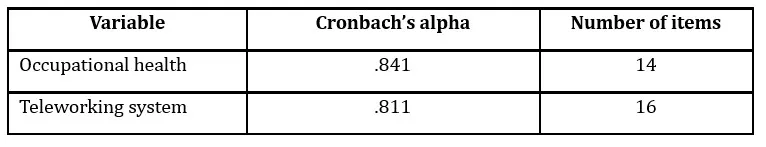 The results of the reliability test using Cronbach’s alpha coefficient show adequate values for both variables. In the case of Occupational Health, a value of α = 0.841 was obtained, while for the Telework variable the value was α = 0.811. According to George & Mallery (2003), values above 0.80 are considered indicators of high internal consistency, which allows us to conclude that the questionnaire used is sufficiently reliable for measuring the study variables.