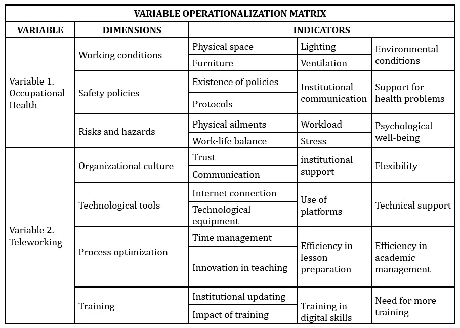 The data collection technique was a survey, administered using a structured questionnaire on a five-point Likert scale, which included dimensions of occupational health and teleworking (Kerlinger & Lee, 2002). The validity of the instrument was established through expert judgment, ensuring the relevance and consistency of the items (Escobar & Cuervo, 2008).