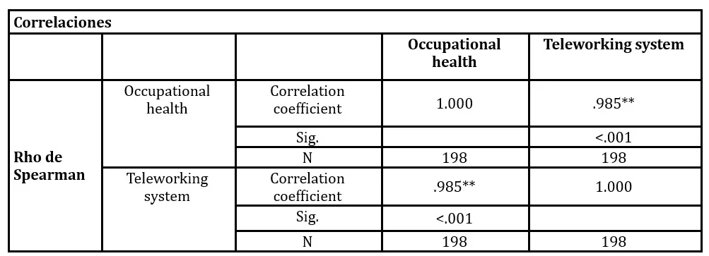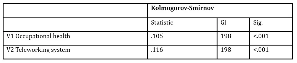 The Kolmogorov-Smirnov test revealed that both the Occupational Health variable (K-S = 0.105; p < 0.001) and the Telework variable (K-S = 0.116; p < 0.001) have significance values lower than 0.05. This indicates that the data do not follow a normal distribution. Consequently, to test the hypotheses, it was decided to apply non-parametric tests, specifically Spearman’s correlation coefficient, which is appropriate when the data do not meet the assumption of normality (Hernández-Sampieri & Mendoza, 2018).
