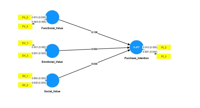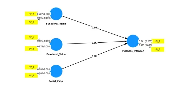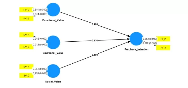 As can be seen in Figure 1, functional value does not have a significant influence (0.136 > 0.05) on purchase intention when we consider the entire sample, including both genders, men and women. The same occurs when considering only the female sample (0.248 > 0.05), as shown in Figure 2. Finally, when considering the male sample alone, the same occurs (0.406 > 0.05), as shown in Figure 3.