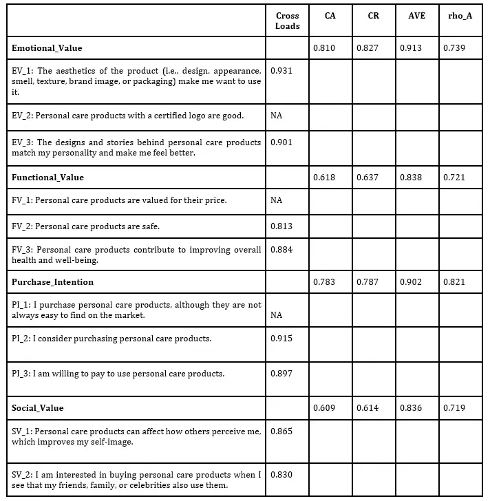 To maintain reliability and validity criteria, questions EV_2, FV_1, and PI_1 have been removed from the analysis. This decision was made after performing the cross-loading analysis, obtaining the results shown in Table 1.