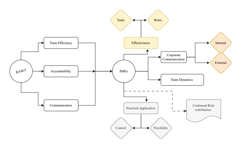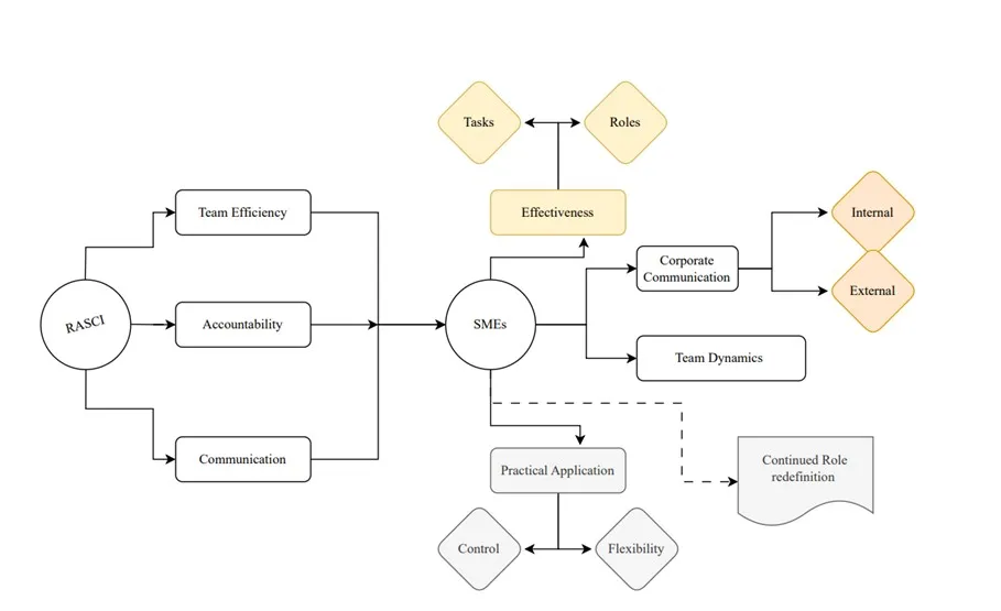 The RASCI matrix, an instrument that outlines team roles and responsibilities such as Responsible, Accountable, Support, Consulted, and Informed, suggests a structured process for role definition, decision-making processes, and communication strategies potentially impacting overall SME performance as a whole unit (O’Connor & Mock, 2020; Lee et al., 2021).