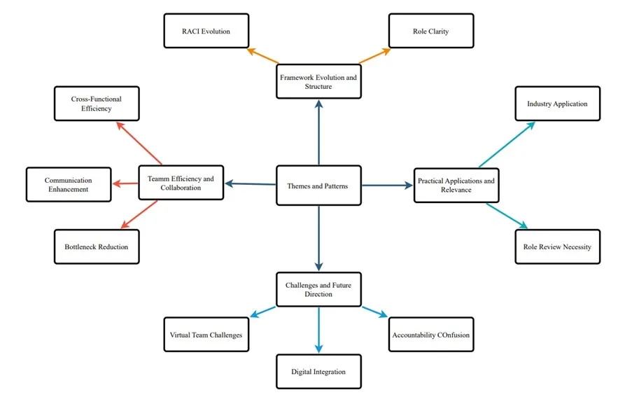 Furthermore, team efficiency and collaboration are the second central theme, showing how the RASCI matrix helps productive teamwork. Within this theme, cross-functional efficiency appeared as a significant pattern, highlighting that the matrix enables smooth collaboration across departments by clearly defining roles. The communication enhancement pattern emphasizes the matrix’s role in enhancing information flow, ensuring all team members stay informed. Further, bottleneck reduction was identified, indicating how clear role assignments prevent workflow delays and keep projects on track by assigning accountability. The third theme, practical applications and industry relevance concentrates on the RASCI matrix’s adaptability and practical use across different sectors. The industry application pattern suggests the matrix’s versatility, as it has been successfully implemented in different industries, from healthcare to technology. The role review necessity pattern indicates that regular review of role assignments is necessary for maintaining relevance.