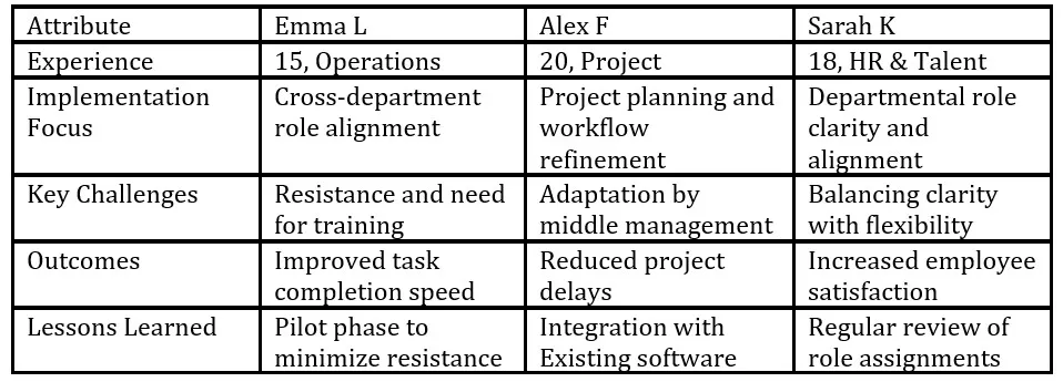 The third Interviewee was Sarah K, from EcoPulse, with 8 years in HR, concentrating on talent development, performance management, and team structure within large multinational corporations. Sarah was instrumental in adapting the RASCI framework to refine roles across departments, aligning employee competencies and performance metrics. Moreover, Sarah acknowledged that RASCI simplified communication and accountability, particularly during cross-departmental projects where role clarity was essential. However, she faced challenges balancing role clarity with flexibility, as some employees were concerned that RASCI would restrict their contributions. She also emphasized the need for ongoing role assessments to keep RASCI assignments applicable. Sarah also noted improved employee satisfaction due to decreased task ambiguity. At last, Sarah indicated regular review and realignment of roles within the RASCI matrix to adjust to growing project needs.