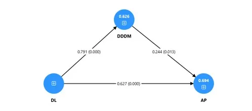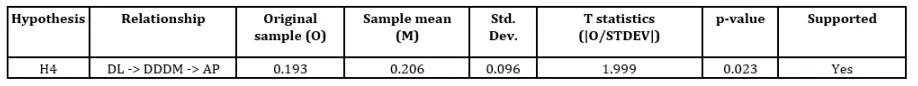 To test the mediation hypotheses, this study followed the suggestions of Preacher and Hayes (2004, 2008) by bootstrapping the indirect effect. If the confidence interval does not straddle a 0, then it can be concluded that there is significant mediation. As shown in Table 7, DL -> DDDM -> AP p-value is significant. The confidence intervals bias corrected 95%, also did not show any intervals straddling a 0, thus confirming the finding. These results indicate that the data-driven decision-making partially mediates the influence of digital leadership on adaptive performance. Thus, H4 is also supported.