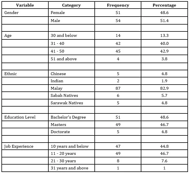 Table 2 shows the demographics of the respondents, which includes their gender, age, ethnic group, education level, and job experience. Female and male respondents are fairly distributed. Most of the respondents are from the age groups of 31-40 and 41-50. Malay is the highest respondent. The education level is mostly bachelor’s and master’s degrees. Finally, on job experience, the majority of respondents are coming from the group of 20 years of experience and below.