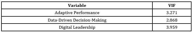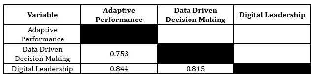 This study tested the measurement model to test the validity and reliability of the instruments used, following the guidelines of Hair et al. (2022). All constructs in this study, which are digital leadership, data-driven decision-making, and adaptive performance, were modeled as reflective constructs. This study assessed the loadings, average variance extracted (AVE), and the composite reliability (CR). The values of loadings should be ≥0.5, the AVE should be ≥ 0.5, and the CR should be ≥ 0.7. As shown in Table 4, the AVEs are all higher than 0.5, and the CRs are all higher than 0.7. Thus, the measurement model was valid and reliable.