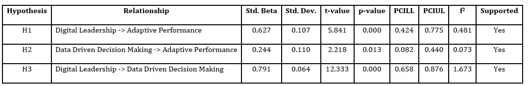 Then, the structural model has been run to test the hypothesis developed. The path coefficients, standard deviation, t-values, p-values, f2, r2, and hypothesis testing are reported in Figure 1 and Table 6. The r2 value indicates the level of predictive with a value of 0.694 showing moderate. The effect size, f2, the value of 0.481, shows a major effect of the digital leadership on the adaptive performance. All three paths are significant, with p-values less than 0.05, thus H1, H2, and H3 were supported.