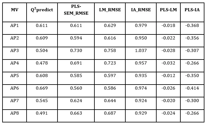 Additional analysis using PLSpredict, as suggested by Shmueli et al. (2019), has been applied. If all the item differences (PLS-LM) were lower than, there is strong predictive power; if all are higher than, predictive relevance is not confirmed; while if the majority is lower than, there is moderate predictive power; and if minority, then, there is low predictive power. Based on Table 7, all the errors of the PLS model were lower than the LM model, thus we can conclude that our model has a strong predictive power.