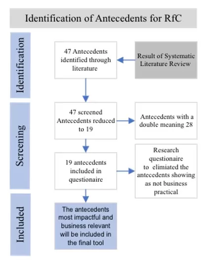 The first step was to identify the antecedents of RfC from the literature, then check their business applicability and eliminate duplicates with identical meanings, which eliminated 21 antecedents. The 19 remaining antecedents were selected for further evaluation in the questionnaire as shown in Figure 1.