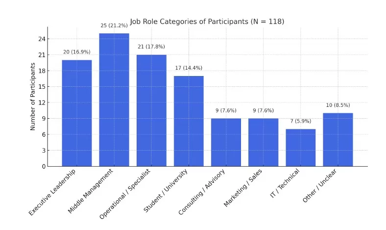 To assess the professional backgrounds of participants, respondents were asked to report their current job title (Question 1.2). A total of 118 valid responses were collected. Since job titles were entered as free-text, the dataset required comprehensive cleaning and standardization. This included normalization of spelling and capitalization, translation of foreign-language terms, and consolidation of synonymous roles. Additionally, clearly erroneous or ambiguous entries were grouped under “Unclear / Invalid”. Following this cleaning process, job titles were categorized into functional role groups using a rule-based classification scheme. These included leadership, management, technical, HR-related, academic, and other professional domains. One missing entry was also explicitly added to the “Unclear / Invalid” group to preserve the complete response base of N = 118.