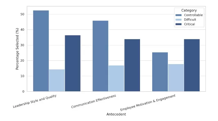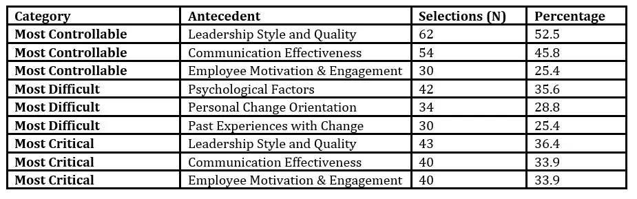 As illustrated in Figure 5, the most frequently selected antecedents across all categories confirm the centrality of leadership, communication, and motivation in shaping organizational readiness perceptions. The figure visually highlights the comparative prioritization of these factors across perceived controllability, difficulty, and criticality.