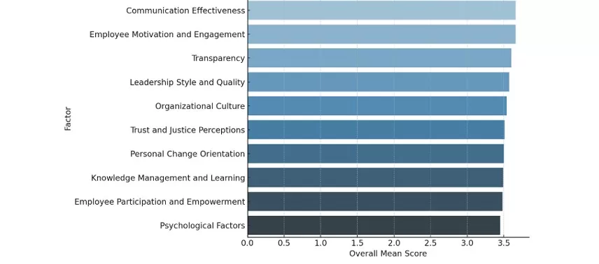 In terms of perceived influence, the top factors included Transparency (M = 3.70, SD = 1.18), Communication Effectiveness (M = 3.64, SD = 1.07), and Employee Motivation & Engagement (M = 3.60, SD = 1.10). Similarly, for perceived effectiveness, Communication Effectiveness (M = 3.69, SD = 1.08), Employee Motivation & Engagement (M = 3.61, SD = 1.16), and Transparency (M = 3.51, SD = 0.99) were among the most positively evaluated antecedents.