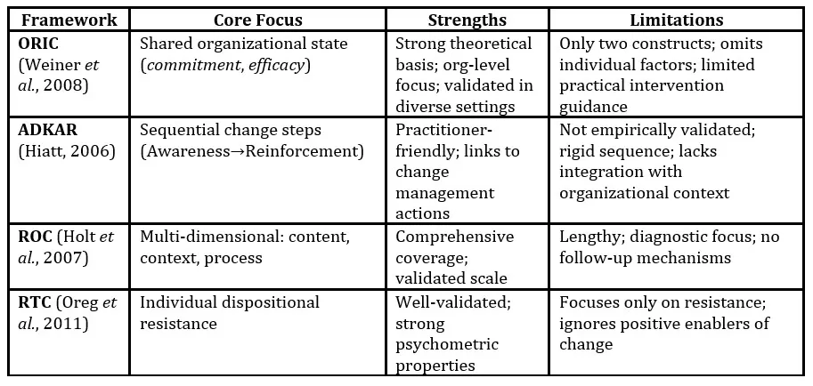 Scope of antecedents – Many frameworks measure a narrow range of factors (e.g., ORIC’s two constructs, RTC’s resistance focus), omitting other empirically supported antecedents relevant to successful change.