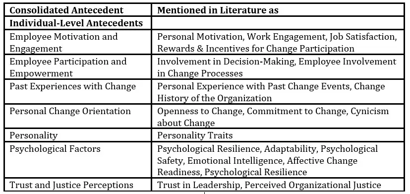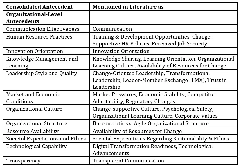 Together, these 15 antecedents reflect a rigorously validated foundation for the design of a future RfC measurement tool. Notably, they include a balanced integration of both organizational-level (e.g., leadership, culture, structure) and individual-level antecedents (e.g., motivation, psychological readiness, trust). This dual-level coverage was defined as a critical requirement in the conceptual phase of this research (Voggenreiter et al., 2025), ensuring that the instrument will be capable of capturing both systemic and person-centered dimensions of change readiness.