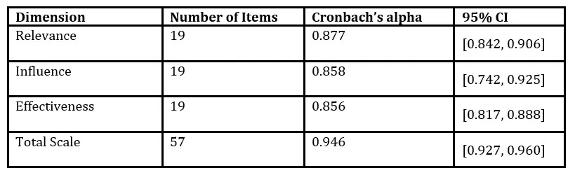 Subscale analyses further confirmed high reliability, with the Relevance dimension (19 items) achieving α = 0.877, 95% CI [0.842, 0.906], Influence (19 items) α = 0.858, 95% CI [0.742, 0.925], and Effectiveness (19 items) α = 0.856, 95% CI [0.817, 0.888] (see Table 4). These values exceed the conventional threshold of 0.70 for acceptable reliability (Tavakol and Dennick, 2011), suggesting that all subscales reliably measure key dimensions of the RfC framework in organizational contexts.