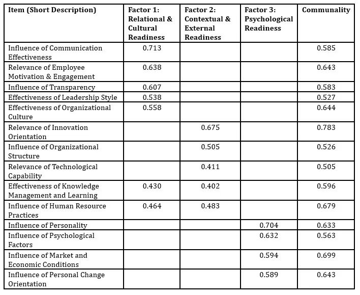 Each factor consisted of items with strong loadings (≥ 0.40), and items with cross-loadings (loadings ≥ 0.40 on multiple factors with differences <0.2) or low communalities (<0.3) were excluded from interpretation to ensure clarity. The three factors were labelled based on empirical item loadings as Relational & Cultural Readiness (reflecting interpersonal and value-driven capacities, e.g., communication effectiveness, leadership style, organizational culture), Contextual & External Readiness (emphasizing dispositional and environmental influences, e.g., societal expectations, market conditions), and Psychological Readiness (capturing individual emotional and cognitive preparedness for change, e.g., psychological factors, personal change orientation), partially deviating from the theoretical dimensions (Relevance, Influence, Effectiveness).