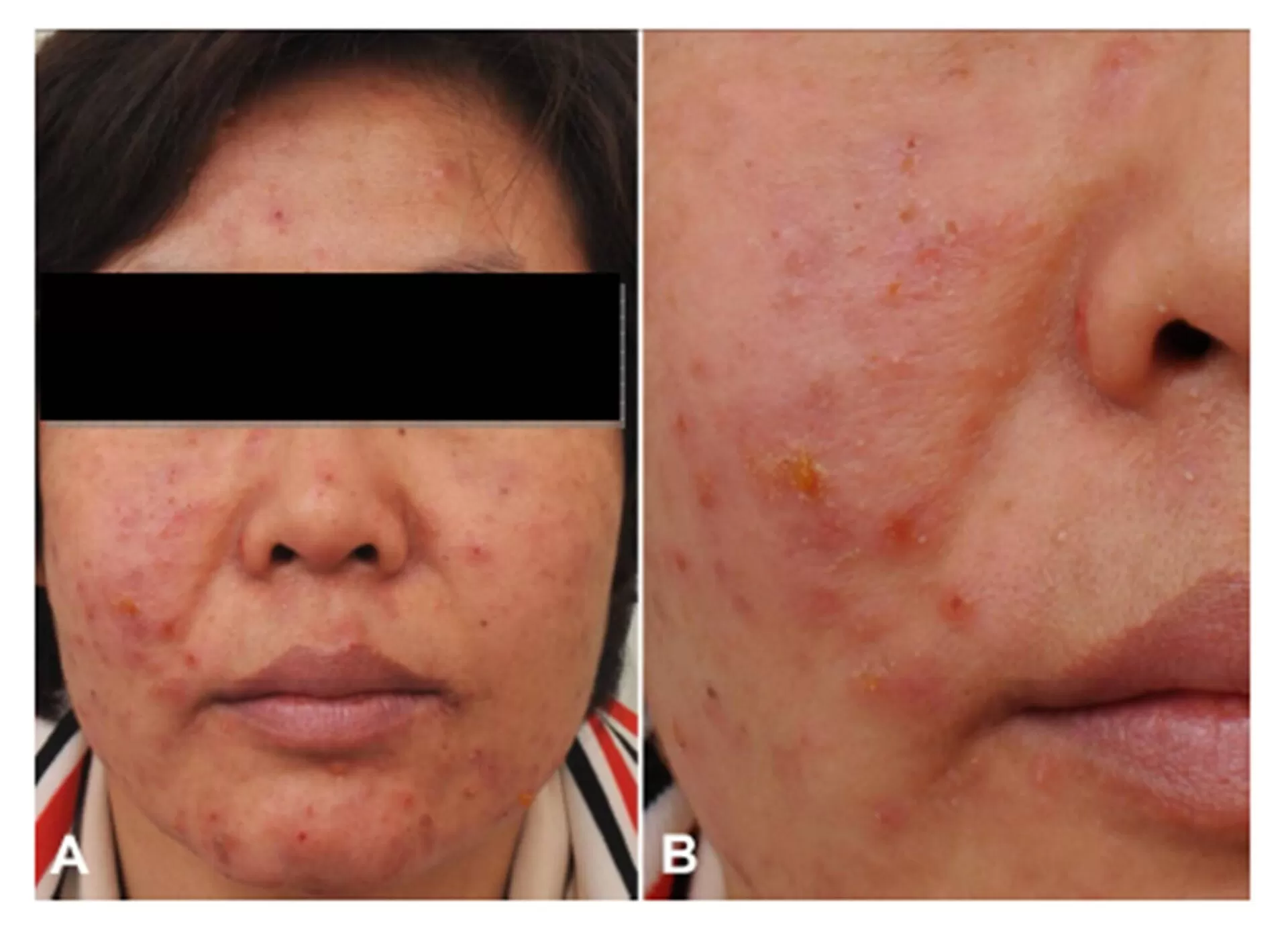 A 45-year-old Korean woman presented to our department with multiple itchy erythematous papules on the face, anterior chest, upper back, and right upper arm that had progressed over a one-year period. The patient had been treated at private clinics with systemic antibiotics such as cephalosporin and minocycline, as well as systemic antiviral agents such as acyclovir and famciclovir. However, her skin symptoms were poorly controlled. Her medical history indicated that she had been treated for pulmonary tuberculosis 30 years prior. In addition, she had a history of recurrent oral ulcerations that had persisted for over ten years and genital ulcerations that had persisted for over six years.