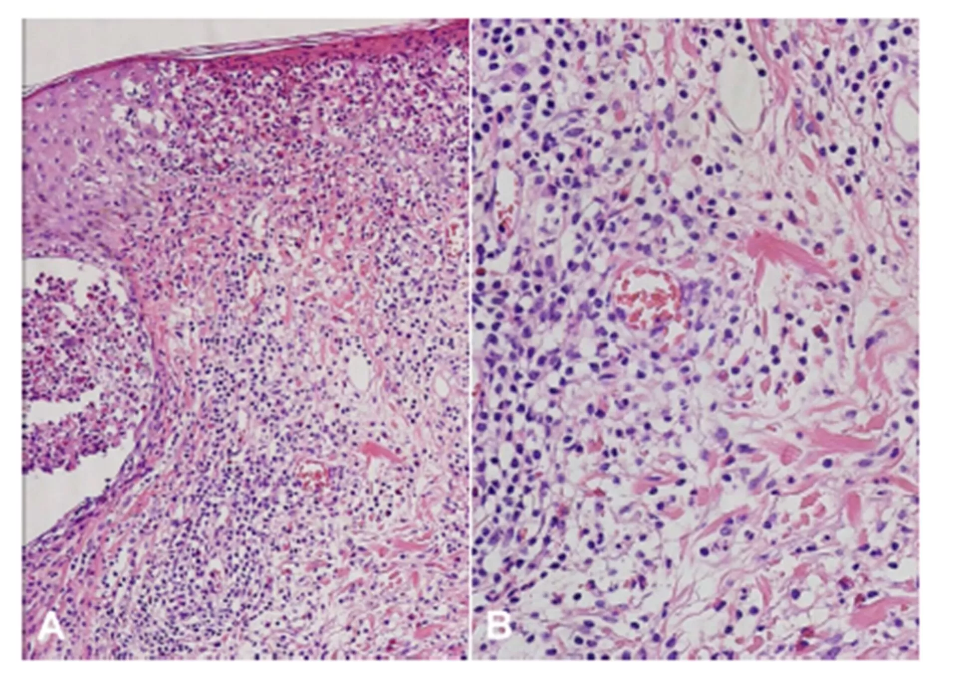 Figure 2: (A) Marked infiltration of eosinophils into hair follicles and perifollicular areas with (B) dermal lymphocytic infiltration around the blood vessels (H&E, A: X200, B: X400)