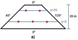 For each calculated horizontal line, the portions contained inside the room are calculated using line intersection equations. After that, for each line segment the length is calculated, then divided by the diameter of illumination and finally rounded up to determine the necessary number of lights. The lights can then be evenly distributed along the line segment. For example, in Fig 15 a) the room’s height is 20 m and the diameter of illumination of each light is 12 m. The following calculations can be done:
