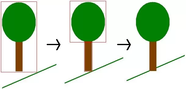 Next, objects such as trees, flowers, picnic tables and so on, can be set on the areas. An exterior object can have one of two types of placement: flat against the ground or placed vertically. In the first type, if the land has an inclination, the object will also be inclined so that it continues flat against the ground. In the second type, the object is placed vertically, no matter what the land’s inclination is, so that a tree, for example, does not tip. For this type of placement, an algorithm must be applied to determine the objects’ correct altitude at the same time that it ensures that it will not float above the ground in the final 3D model (see first image of Fig 17). To achieve these results, the object’s bounding boxes are decomposed into smaller parts, just like the positioning of interior objects above others. In the second image of Fig 17, the tree is divided in two parts: treetop and trunk. Then, the geometry of the lowest part of the object, i.e. the one that comes in contact with the ground, will be used to determine the object’s final altitude ensuring that no part of the object will float above the ground. In the third image of Fig 17, the trunk’s geometry is used to achieve the correct positioning.