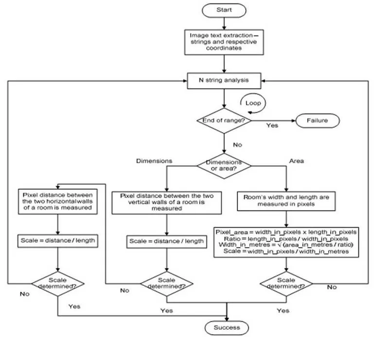 Typically, floor plans have room measures defined as length and width (i.e. metres) or as total area (i.e. square metres). So, to determine the scale, the user has to carry out some calculations. To save the time of this manual process, we have developed an algorithm — FPSE (Floor Plan Scale Extractor) — which uses OCR (Optical Character Recognition) technology to extract the impressed text from a digitised image file (raster format). All future calculations are then based on the extracted scale. The FPSE steps are described in the following flow chart: