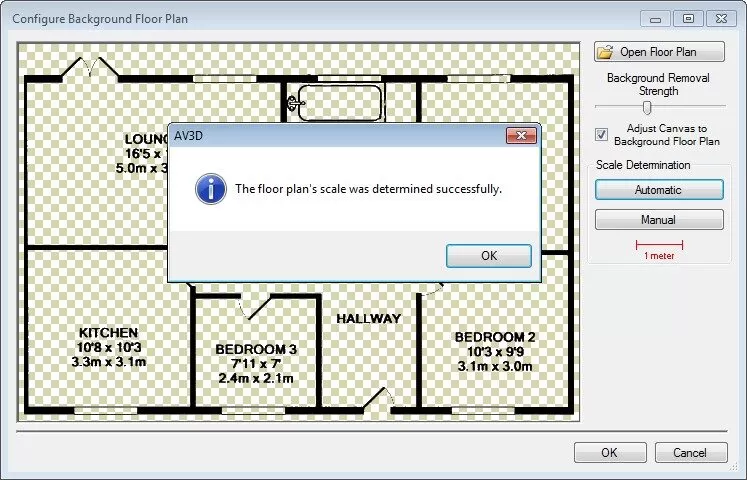 In the previous figure, the lounge room has a 5.0m width and a 235 pixels distance between walls. Dividing 235 by 5 we obtain the 47 pixels per metre scale. If the strings were defined in square metres and not in metres, and the lounge room had a 17 square metres area, the calculations would be as follows: