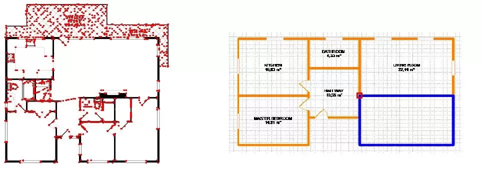 SUSAN’s effectiveness in vertex detection, shown in the first image of Fig 21 where the detected vertexes are highlighted, enabled its integration in our method for the automation process of 3D buildings’ creation. The result of its application in the AV3D prototype is shown in the second image of the same figure, where the little square represents the automatic snap vertex resulting from the merging of the two rooms. The user places the cursor next to a vertex and if the method considers that the room can be closed, a new wall is automatically placed, highlighting the room blue, thus, preventing errors and facilitating the process.
