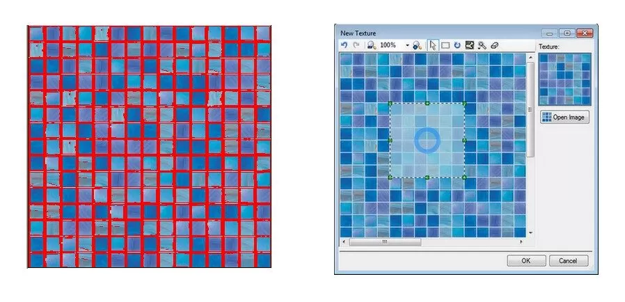 To make the texture application process easy, fast and realistic, it was necessary to develop a texture extraction process. To achieve this goal, we had to resort to a common method in image processing, that is, the detection of contours in an image. Contours in images are strong contrast intensity areas (from one pixel to the other). Contour detection procedure significantly reduces data quantity and filters useless information, thus, preserving the image’s structural properties. The developed texture detecting technique is executed when the user needs to add new textures to apply to a wall, floor, ceiling, window, amongst others. This way, the user sees his/her work facilitated by simply passing the mouse cursor over an image to automatically discover several highlighted rectangular areas (most of the times, tiles and mosaics) in the cursor’s position.