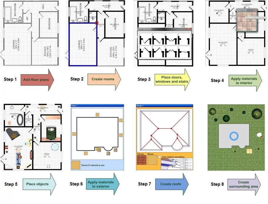 Floor plan modeling: in the vectorial floor plans the user can now indicate the connections between each floor by placing staircases; define the types of floor, walls and ceiling, whose real colours and textures can be extracted from photos of the real rooms; place windows and doors that the automatic process did not detect; place interior and exterior objects manually or automatically; create the roofs; create the surrounding environment.