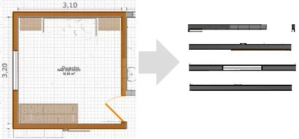 In this step, the algorithm starts by cropping the parts of the image that lie under each wall designed by the user. The new images have a length equal to the wall and a width equal to the thickness of the designed wall plus an increment of 50% tolerance. Fig 5 shows the four new images extracted from a room. If the wall drawn by the user is curved, then the part of the image extracted by the algorithm is transformed into a straight shape so that the algorithm becomes more efficient and simpler.