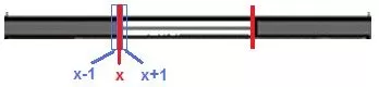 After having detected the vertical lines, a second filter has to be applied to determine those which may be potential window’s/door’s borders. A line is an edge of a window/door if it has on one side a wall and on the other a window/door, or if it has a window/door on both sides. Therefore, for each detected vertical line, the algorithm calculates for each side the percentage of the line that is in contact the x-1 and x+1 lines (see Fig 6). If at least one of the two sides has a contact percentage lower than 75%, then the vertical line is considered to be a potential edge of a window.