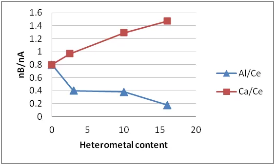 Figure 2: Dependence of the nB/nA (strong sites) on the concentration of the heterometal (Ca or Al) into the CeO2 matrix