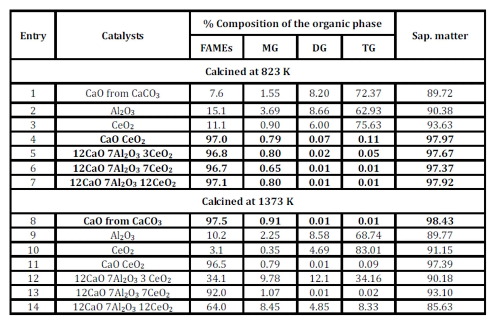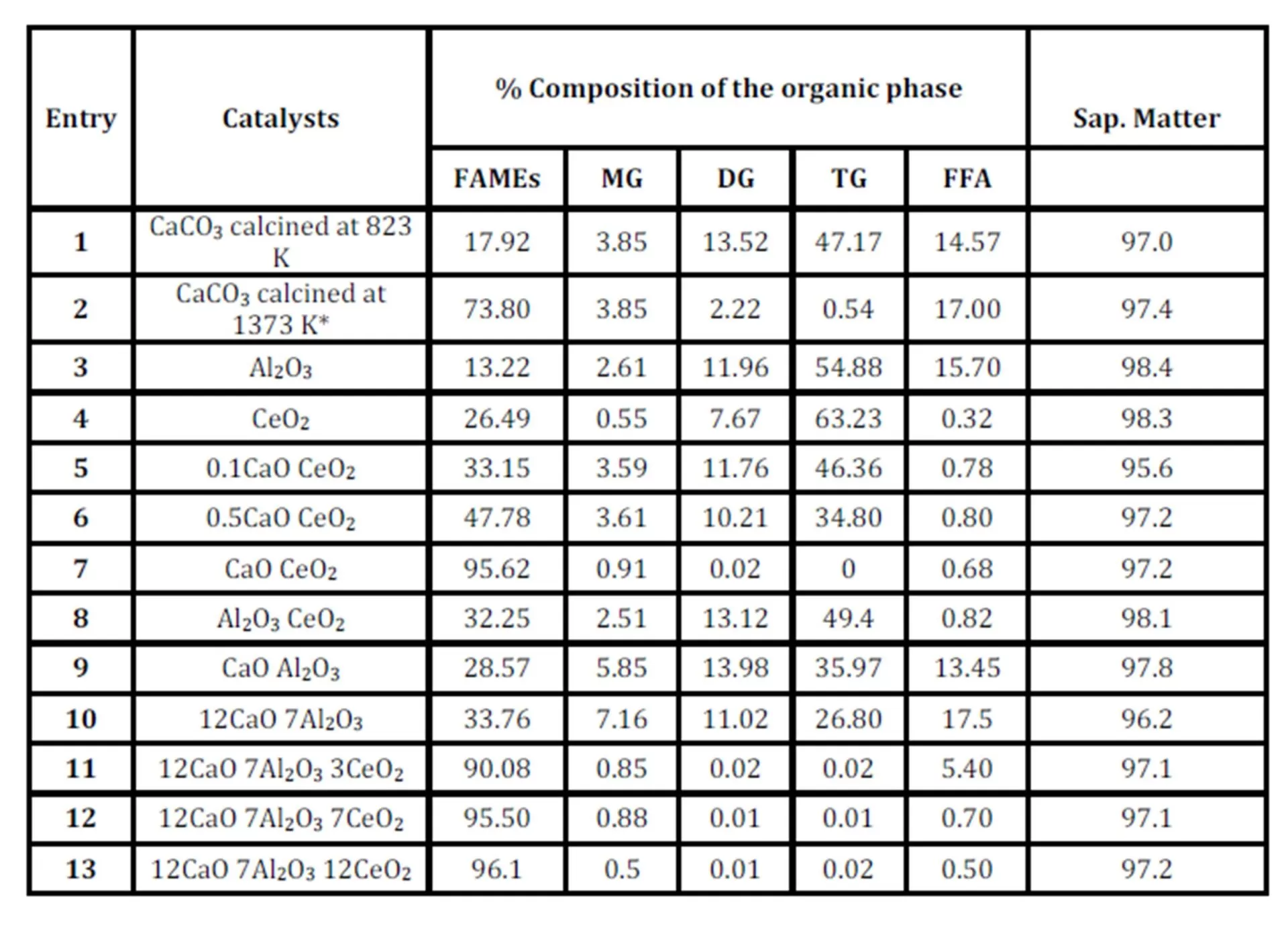 The catalytic systems constituted from Al-Ce (Entry 8) and Ca-Al (Entries 9-10) do not convert efficiently the starting oil into FAMEs at the same level as Ca-Ce, confirming the poor activity of Al2O3 and the acidic properties of CeO2.