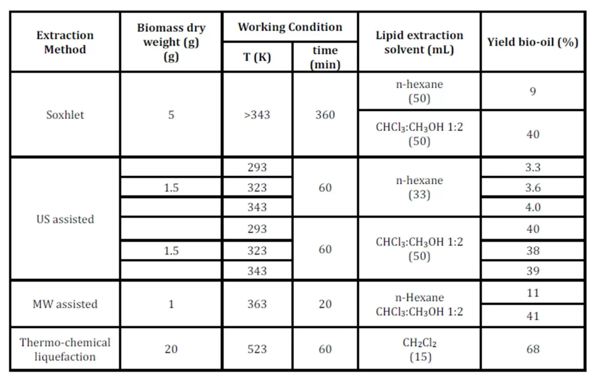 Table 3: Amount of bio-oil obtained under different conditions from Nannochloropsis sp