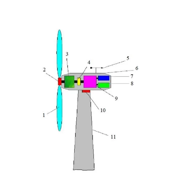 To begin with, everyone needs to know how a wind turbine looks like and its principle of functioning. A wind turbine is an ensemble used for over 3000 years with a precise configuration (presented in Fig. 1) that includes the blades (1) meant to capture gusts of wind and to set in motion the rotor (2). This last one gives an impulse to a low-speed shaft (3), then to a gearbox connected to a generator (7). The generator, based on electromagnetic induction, produces wind energy which is then forwarded to an electrical station.
