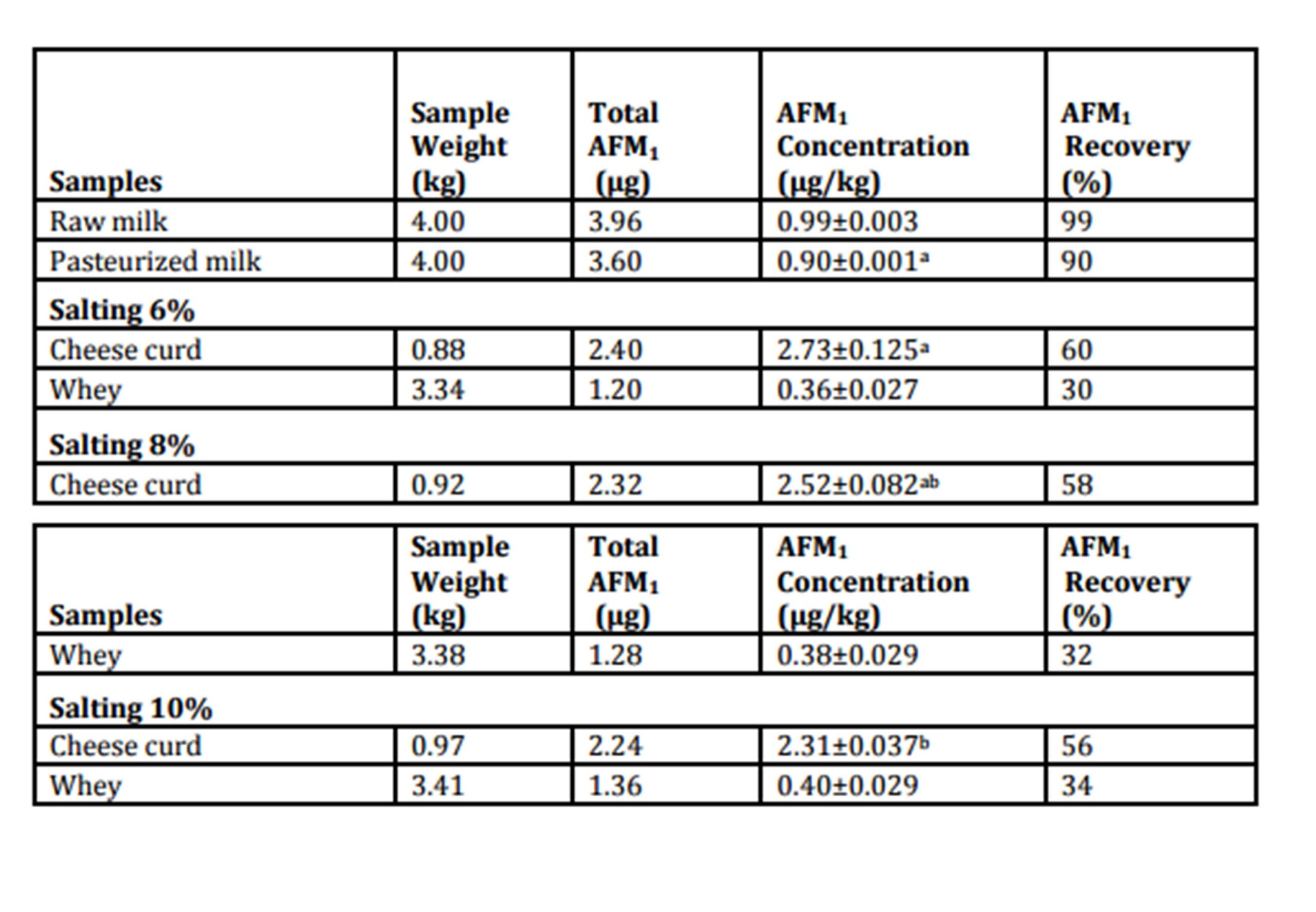 Even though ~85% of the milk ends up as whey, a concentration of AFM1 in cheese curd occurs because AFM1 has an affinity to casein protein fraction in milk and it is more soluble in water than in oil. Levels of AFM1 in Domiati cheese that are almost 3 times higher than in the milk from which the cheeses were made is in agreement with other studies on soft cheeses (Yousef & Marth 1989; Govaris et al., 2001; Prandini et al., 2009). Although, there have been other studies that have shown differing distributions of AFM1 in milk between curd and whey. Some of these differences occur when there are different levels of AFM1 in the milk. Some authors reported that half or more of the AFM1 transfers into the whey: 50%, 61%, 66%, 86%, and 100% according to Stubblefield and Shannon, 1974; Wiseman and Marth, 1983; Blanco et al., 1988; Stoloff et al.,1981; and Purchase et al., 1972, respectively. In contrast, others have reported that most of AFM1 transfers into the curd at levels of 66%, to 72%, 73% to 77%, 80%, and 100% according to Mashaley et al., 1986; El-Deeb et al., 1992; McKinney et al., 1973; and Blanco, et al., 1988, respectively. In a non-rennet cheese such as Ricotta cheese, most of the AFM1 (~94%) goes into the hot whey when as the whey proteins precipitate (Cattaneo et al., 2013). These varying transfer rates can be ascribed to factors such type and degree of milk contamination, differences in milk quality, presence of curd fines in the whey, the cheese manufacture process, as well as experimental AFM1 measurement techniques such as extraction method, methodology, and expression of the results.
