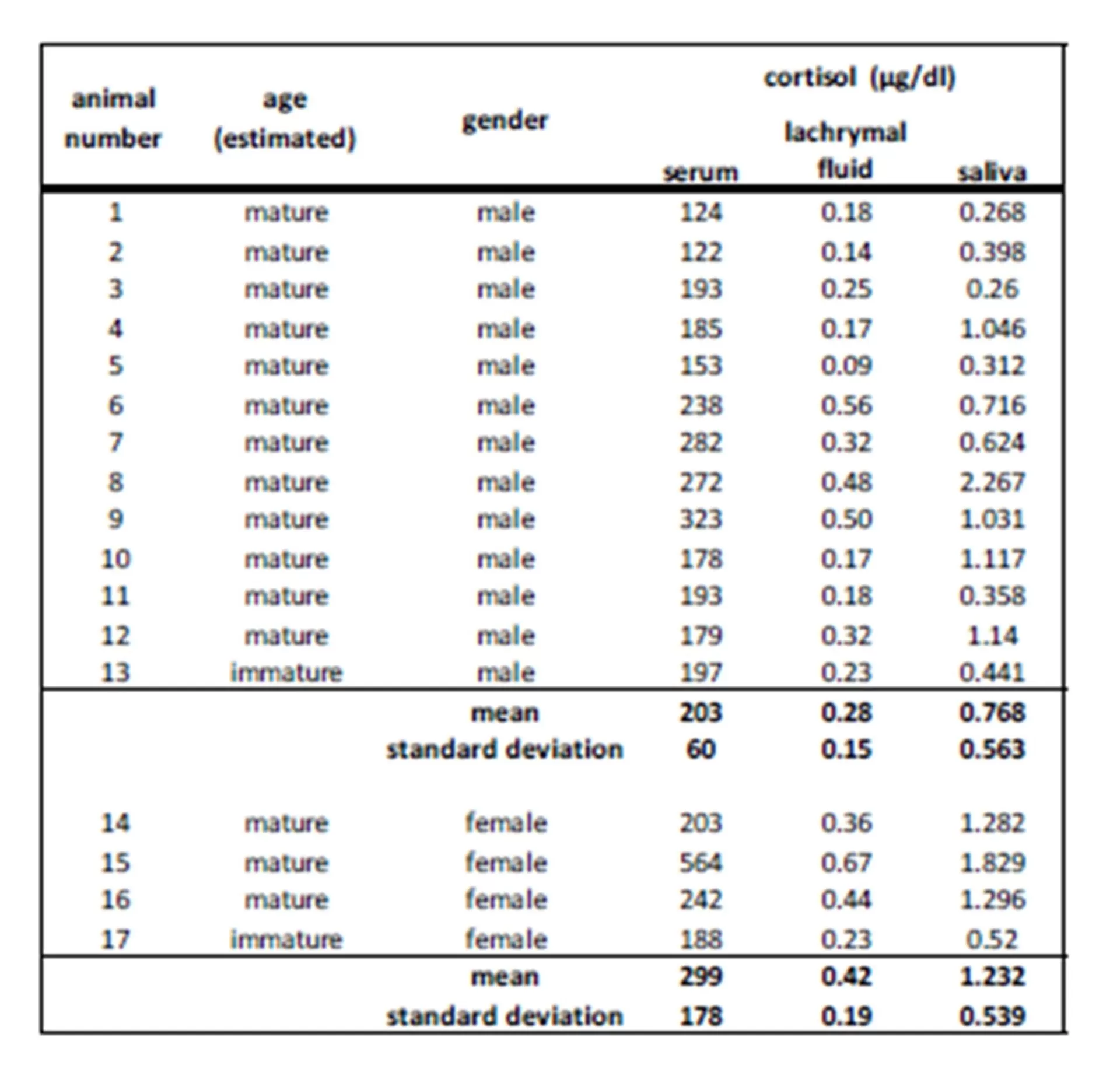 Cortisol was detected in all sampling materials (lachrymal fluid, saliva, blood) investigated in the present study.