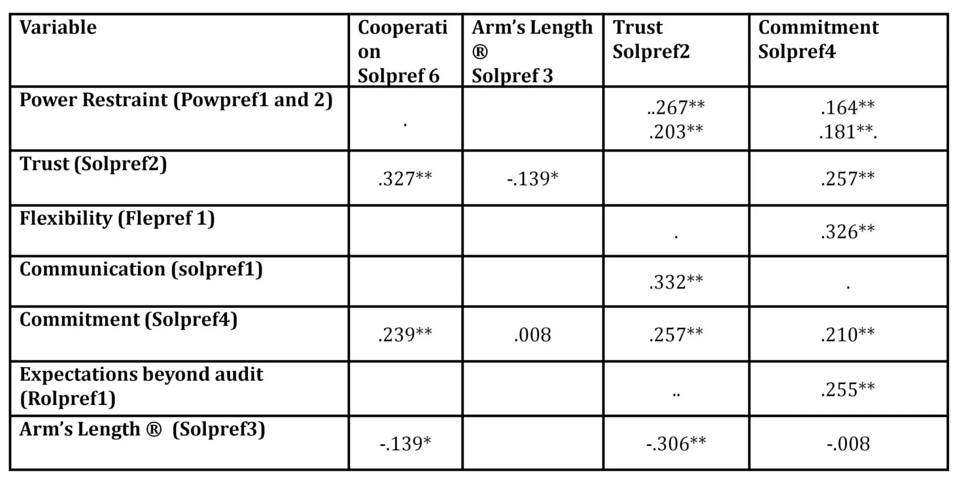 H10: We hypothesized in H10 that there would be a positive relationship between Arm’s Length (Solpref3) and Commitment (Solpref4) and the results show a significant relationship between the two variables, r = .-008, p(one-tailed), < .05. Therefore, H10 is not supported.