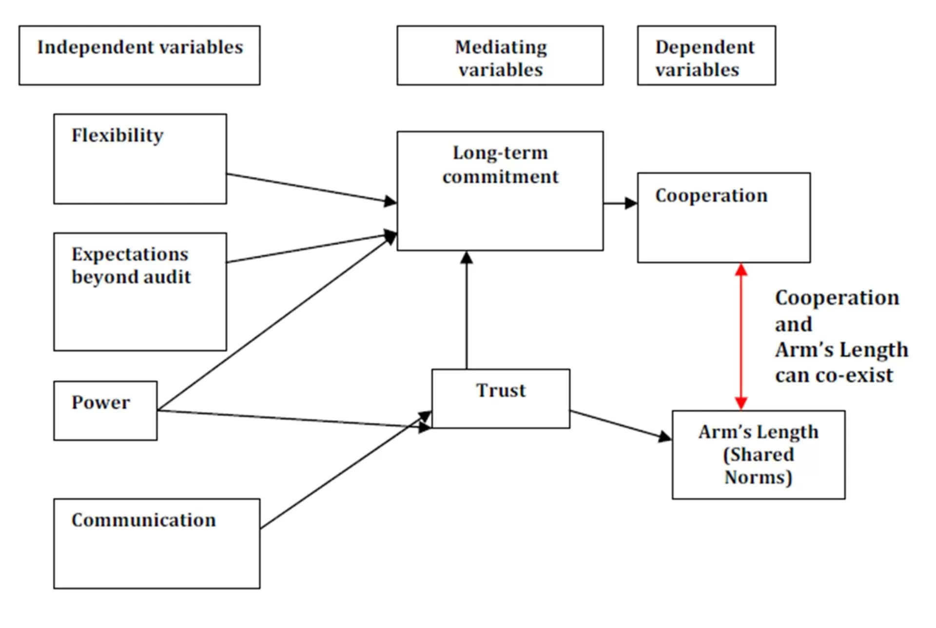 From these results, we find that commitment is a necessary antecedent for cooperation (as others have found, Morgan and Hunt, 1994; Ruyter and Wetzels, 1999), but commitment is not enough to encourage the client to willingly remain at arm’s length. Trust is the key mediating variable that influences both the client’s willingness to cooperate and remain at arm’s length.