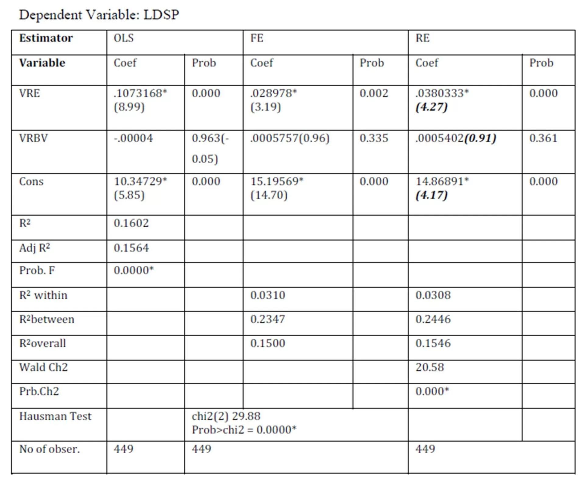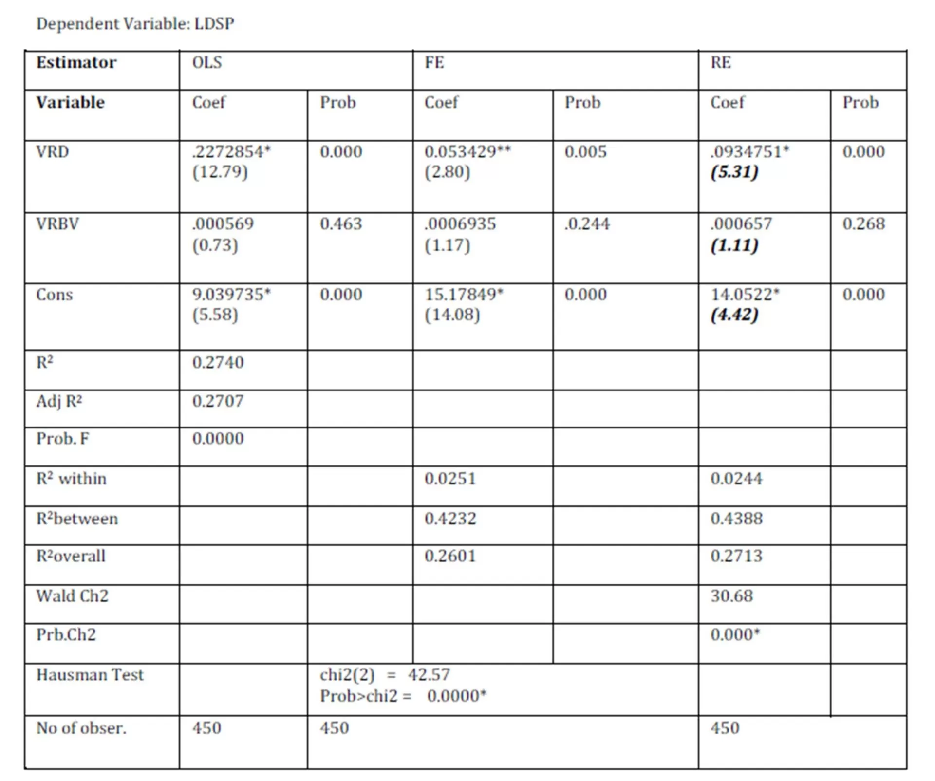 Where LDSP is the dependent variable; β0, β1, β2 , are regression coefficients with unknown values to be estimated; VRD and VRBV are the independent variables and the error term (eit ) is used as surrogate for all other variables not included.